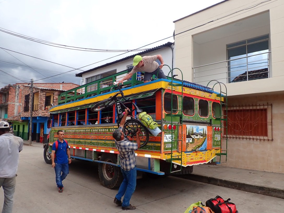 Nonetheless we persisted and managed to find some awesome rides most of which involved big climbs. The first leg, from Cali to La Virginia, was relatively flat, through sugar cane country and some quiet backroad towns. The general lack of traffic compensated for the occasional 5-trailer long ‘cane train’, its last trailer weaving erratically onto the shoulder….scary! We then attempted the 8 km climb at 10% grade to Belalcazar. It was an absolute killer (I can hear all the hardcore Squamish riders scoffing at the suggestion. Try it with a 45+ kg bike!) and half way up a farmer gave us a lift to the top, where we pedalled along a beautiful ridge through coffee country. Two days later we almost started up the long climb from Supia to Caramanta that I had misinterpreted as 1 km of dirt and 27 km paved (it was the reverse). We got our bikes on top of a ‘chiva’ (a converted truck-bus servicing rural communities) for the very rough, boney ride up to the start of pavement….we never would have made it. Somehow our bikes on top of the bouncing bus survived. Another lovely ridge ride followed. On one long descent I was going at what I thought a good clip when a garbage truck passed me at maybe 65 km/hr. Bumper-hitching (remember doing that?) behind the truck was a kid on a BMX bike, no helmet, no shirt waving at me to try and keep up. And so it went.