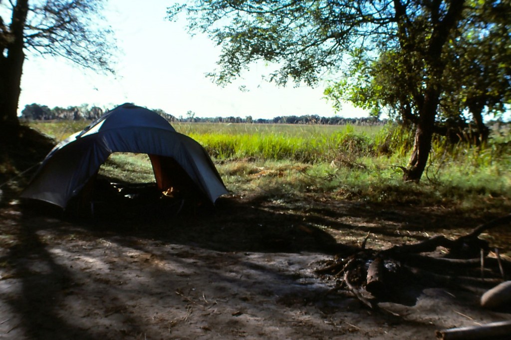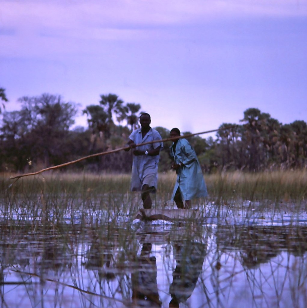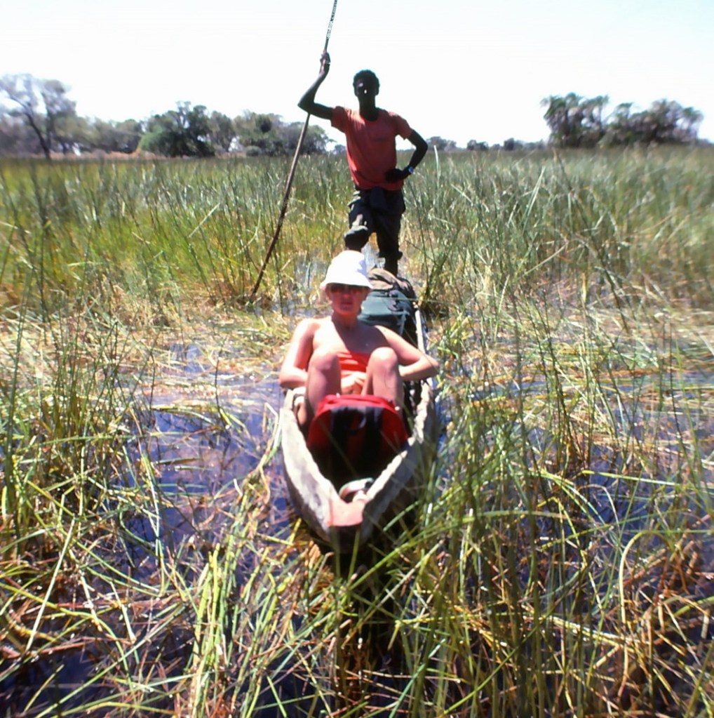 We had some food with us and always planned on picking up more supplies at the proverbial ‘next stop’. As usual, things didn’t work out as planned and when we landed at Maun (the largest town and supply hub for the Delta) we heard that a small plane was flying into Oddballs Camp in the middle of the swamp and if we wanted a ride, we should hurry up and jump on board, which we did. Oddballs, as strange as it’s name, was a haphazard affair struggling to create a safari experience for guests, of which there were very few. They did have a tiny store where we bought some dried soups and where we learnt about travel by makoro (dugout canoe) and how to engage a local villager as our guide. Ben, our Batawana ‘guide’ and makoro paddler, had a vocabulary of less than a 60 words in English, most of which were names of animals. The following morning Ben pulled up in his makoro and we set off on our six day exploration of the delta, but first we needed to go to his village for him to stock up on supplies. Mielie pap (maize meal porridge) was almost all he ate.