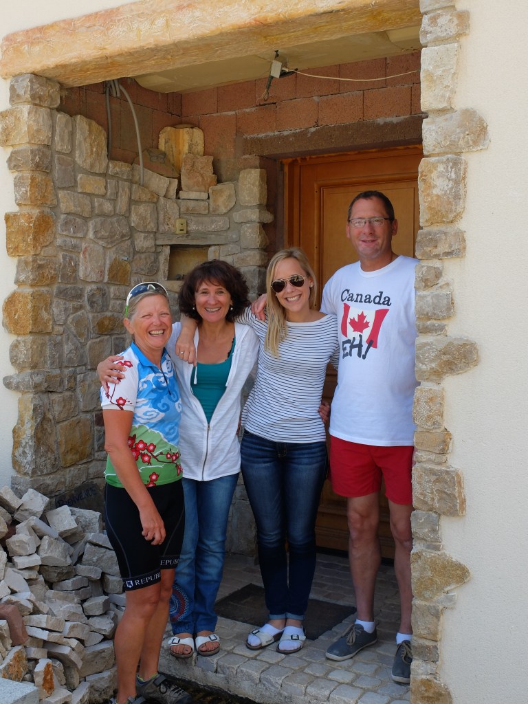 Three hours and 40 kms later and getting hungry, we still hadn’t found an open boulangerie (bakery) for our daily croissant (preferably almond filled) until we pulled into the small town of Baradoux. While standing in the baguette line-up, I struck up a conversation with a man wearing a t-shirt emblazoned with a Canadian flag, a gift from a daughter who had done an exchange stint in Shediac, New Brunswick. One thing led to another and next thing we knew we were having a lovely lunch with Noe, his wife Helene, daughter Camille (the exchange student) and two visiting nephews at their nearby home. Just another example of the wonderful hospitality we continue to experience. I’m not sure why but Canadians seem to maintain a positive image abroad. Other than the Rob Ford debacle, Canada is never in the news so I guess the ‘no news is good news’ adage applies.