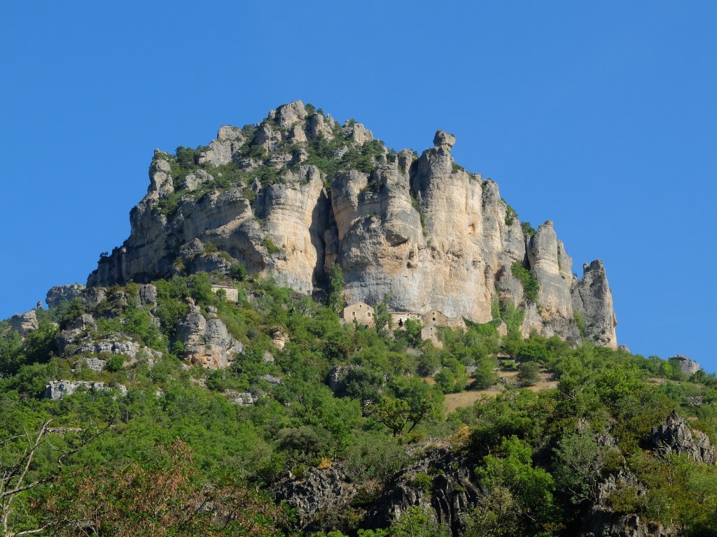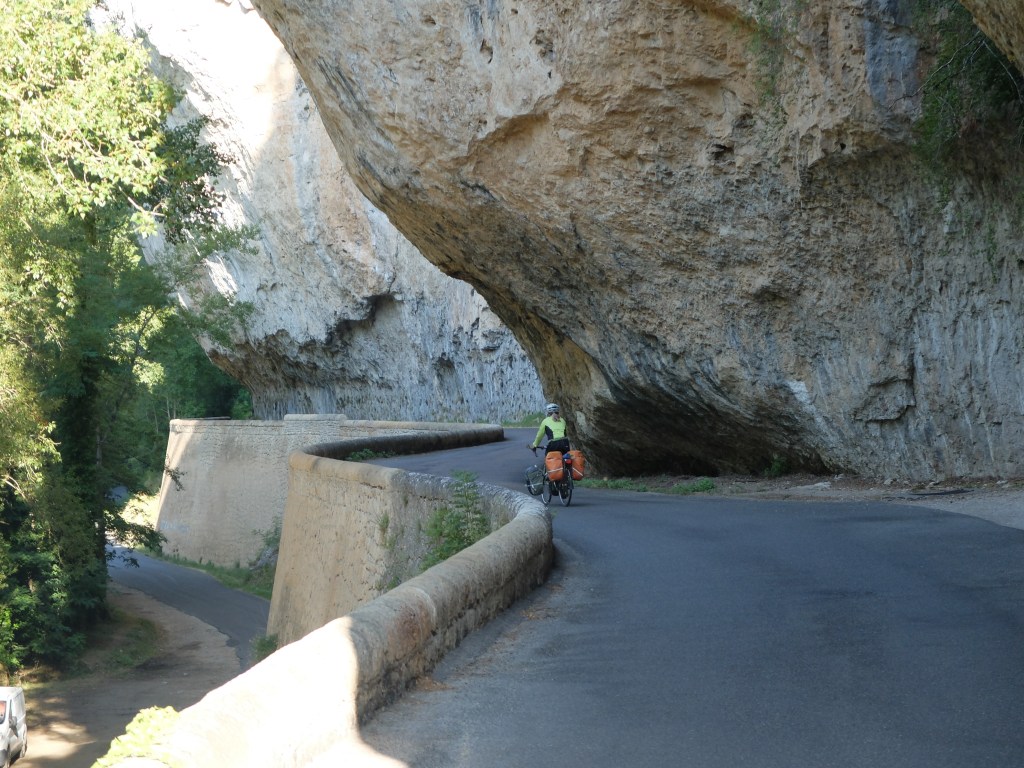 Our next stage through the Ardeches mountains, over the Cevennes plateau and then down the Gorges du Tarn, under the famous Viaduct de Millau and continuing down the Raspes du Tarn has all been awesome riding. We still get wasted by the big climbs (so much for getting in shape!) but routes alongside the rivers (the ‘gorges’), the beautiful scenery, the medieval villages, etc., all make up for the effort. Our tradition of being on the rode before breakfast and riding for a few hours is working well. It seems the French are all on holiday and like to sleep in. We have the roads to ourselves which is a good thing as we constantly stop to take pictures and swerve all over the road taking in the view. We are more likely to be hit by each other than by a passing vehicle.