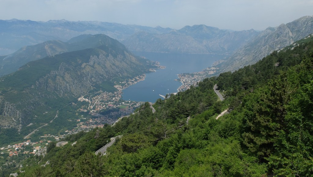 Montenegro is a small, mountainous country, that recently separated, for reasons of pride more than anything else, from Serbia by a slim margin, reminiscent of Quebec’s efforts to do the same. The service sector dominates the economy with tourism being the most important component. Riding from the border into picturesque Ulcinj on quiet backroads didn’t prepare us for the next day’s ride to Budva. Once again there were no shoulders but now the roads were in better shape, the traffic restricted to fast vehicles (unlike Albania) and the drivers aggressive and totally unprepared to accommodate bicycles. We also now had many bridges to contend with (narrow, high & with gusty winds) and for the first time this trip, tunnels. The first few were short and sweet, with the proverbial light at the end of them. But then we hit a 350 M long tunnel with a curve and before I knew it I couldn’t see a bloody thing. Yes, it would have helped if I had removed my sunglasses and installed our lights. You would have to have been there to understand our stupidity. I think it was the next tunnel that we went into, better prepared this time, that Claire crashed in the dirt filled, miserable ‘shoulder’. She was unhurt but we were both shaken by the experience. Feeling drained we stopped at a ‘mini-market’ for some sort of sugar-filled snack (that we would never eat at home) and by chance we were approached by a young guy interested in what we were up to. He advised us to bail on the coastal highway and take the bus from Budva up into the mountains. We perused our smart phone map together and he showed us the route from Cetinje (the old ‘royal’ capital of Montenegro filled with wonderful mid-19th century embassies) up to Lovcen National Park and then down this amazing set of switchbacks to the old port of Kotor (another World Heritage site). To make a long story short, despite others describing the dangers of our planned route and the infamous ‘serpentine’ road, plus the unreliability of the information we had been receiving to date, we decided to go for it. Anything would be better than the coastal highway.