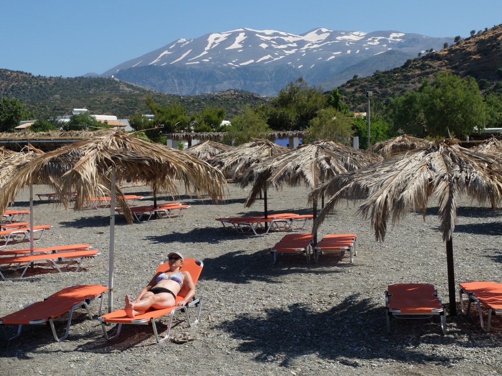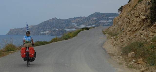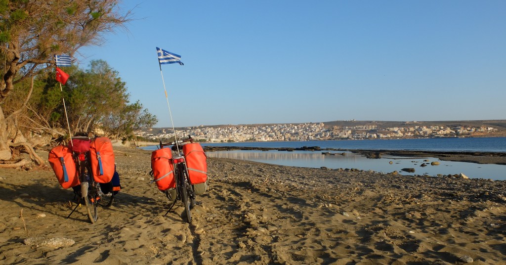 We’re taking a rest day in Crete after three full days of riding this hilly island. Yesterday started with a 90 minute climb straight up from the seaside village (Tsoutsouros) where we had ‘wild’ camped on the beach in the middle of town. We wanted to get on the road before the town got up and noticed these strangers on their beach. It was a gruelling but beautiful climb, devoid of traffic, smooth asphalt and still cool in the early morning. Nonetheless, I did the whole thing maxed out in granny ring and constantly wishing for another gear. In fact without our switch-backing across the road grade I would have had to push my bike. The rip down the other side of the pass on my 100 lb bike is scary fun but the brakes are smoking hot by the bottom…yeah, yeah, as my riding buddies would say, “Who needs brakes?”