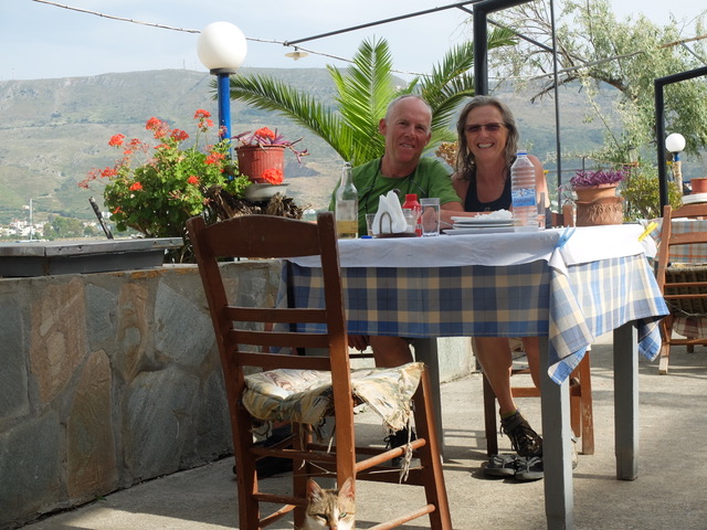Crete has been a wonderful island to traverse. From Sitia to Chania, east to west, in 6 days. We’ve swam the clear, startling blue waters every day, ‘wild’ camped a couple of nights, spent two nights in comfy ‘legit’ campsites, and two nights in proper beds. One of which was a very memorable visit with our Warm Shower’s host Stavros in Ierapetra. Once again, we were blown away by the hospitality. From the moment we rode up to his tiny home at the end of an alley, squeezed between assorted other buildings, we felt right at home. Stavros is a retired physics teacher whose son had done an international bike tour, starting from Vernon, BC, of all places, and decided to participate in his own way with the touring community and we are the richer for it. Stavros is well travelled, well read, knowledgeable on many subjects and a gregarious, born-conversationalist. After a homemade pizza dinner we drove up to the +/- 500 year old mountain village of Anatoli, his ancestral home. We did a walking tour of the village where everyone would greet Stavros (in that demonstrative Greek fashion) then settled in to the front porch of the one and only ‘taberna’ for a bucolic evening of local drink, mezes (the traditional Greek version of ‘tapas’), conversation and soaking up the ambiance of village life.