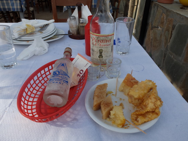 The following day we headed off early for the port city of Souda to be amongst the first on-board the ferry to claim a good sleeping spot. While biding our time we ‘found’ this wonderful beach, that by Crete standards, we had to ourselves. After a swim and a long barefoot walk on firm sand we had an early meal at a large, empty restaurant (deep fried anchovies and french fries). We got talking about life with the owner and before we know it, a complimentary bottle of retsina shows up at the table, followed by a small flask of ‘raki’ and a plate of traditional sweets (as he told us, “raki goes best with something sweet and sweets are best with raki”). Note: We had drank a small bottle of retsina when we first arrived at the beach. Anyway, to make a long story short, despite my best efforts at restricting our consumption (I’m starting to worry about Claire!) we were a wee bit tipsy as we rode off to catch the ferry. The likelihood of this happening, ie., the fine encounter with, and generosity of, the restaurant owner, in a busy tourist town is very slim……and thus my desire to avoid them.